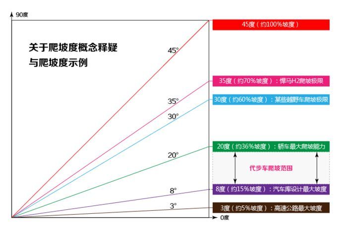 很多老年人,在选购电动轮椅或者智能老年人电动代步车的时候,往往第一句话就会问“你这个电动轮椅的速度太慢了,爬坡能力也太弱了呀,才十几度,有没有动力强的爬坡能力更强的车?”“我们家门口有个坡恐怕得有三四十度,这个电动轮椅能爬上去吗”“怎么你的电动轮椅代步车标注的爬坡能力这么弱呀,这么弱的话那很小的坡也爬不上去呀”“我担心这个电动轮椅连我们小区地库都爬不上来”等等,类似的质疑声是很多老年人朋友的疑问,他们总想买到一个爬坡能力特别强的电动轮椅代步车,这样才感觉能够放心的正常的出行。实际上,之所以出现这个问题,是由于很多人对这个坡度没有具体的概念,比如问他们“你们小区的地下车库出口的坡度大概是多少度”,好多人都会回答“大概有十几度到二十几度吧”,实际上按照国家标准,汽车车库的最大设计坡度也就8度左右,远远达不到十几度二十几度的坡度。小元找了一张坡度演示图,咱们先看下面的图: